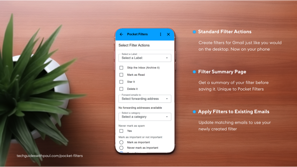 Pocket Filters for Gmail is the missing link you've been waiting for. Designed as a seamless Gmail add-on, you can now create native Gmail filters without ever leaving the app. From your desktop to your mobile, Pocket Filters works consistently across devices.